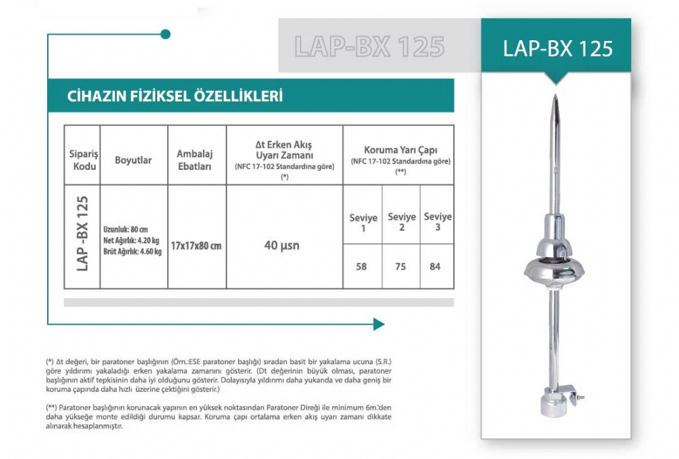 LİVA "LAP-BX 125 Aktif Paratoner Başlığı" Erken Akış Uyartım Sistemi (Early Streamer Emision [E.S.E.]) prensibine göre çalışır. Paratonerin, yıldırımı taşıyacak metal aksamları kimyasal etkileşimlere ve korozyona karşı paslanmaz çelik (İnox) malzemeden üretilmiştir. Bu özelliği ağır doğa şartlarına karşı paratonerin uzun süre ilk günkü gibi sağlam ve dayanıklı kalmasını sağlar.