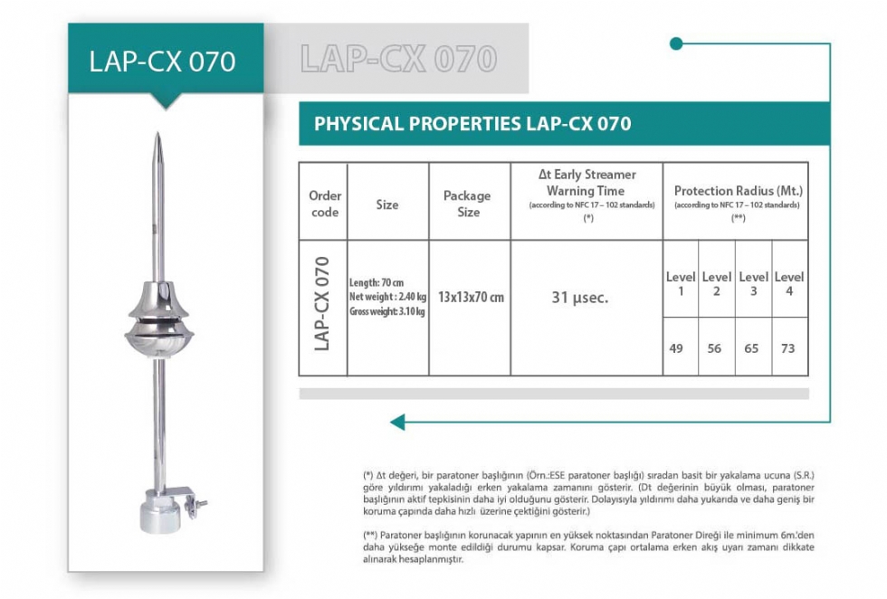 LİVA "LAP-CX 070 Aktif Paratoner Başlığı" Erken Akış Uyartım Sistemi (Early Streamer Emision [E.S.E.]) prensibine göre çalışır. Paratonerin, yıldırımı taşıyacak metal aksamları kimyasal etkileşimlere ve korozyona karşı paslanmaz çelik (İnox) malzemeden üretilmiştir. Bu özelliği ağır doğa şartlarına karşı paratonerin uzun süre ilk günkü gibi sağlam ve dayanıklı kalmasını sağlar.